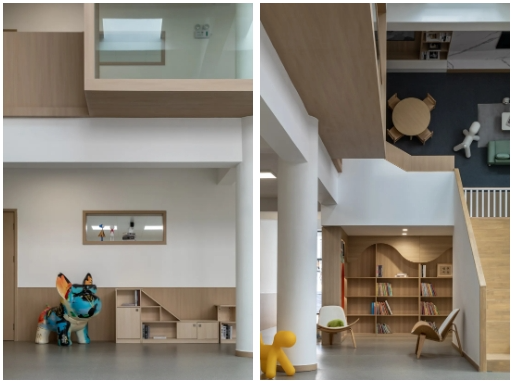 幼兒園設(shè)計(jì)裝修之墻面裝飾能起到保護(hù)墻體、延長使用壽命的作用,也能使室內(nèi)空間美觀、整潔、舒適。奧華選用灰咖楊木墻板和柜體同色進(jìn)行設(shè)計(jì),色系風(fēng)格一致,為孩子們營造多樣性舒適空間。